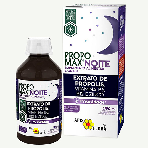 Propomax® Noite foi elaborado especialmente para oferecer um excelente produto, que combina o exclusivo extrato de própolis EPP-AF®com zinco e as vitaminas B6 e B12, que auxiliam no funcionamento do sistema imune, além de ter, em sua fórmula, extratos de camomila e melissa. Propomax® Noite ainda conta com a praticidade de já vir pronto para uso.